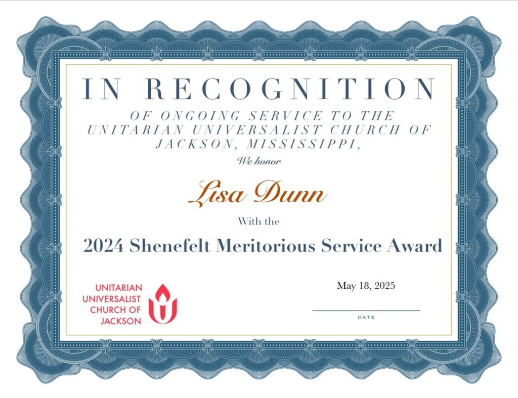 During the 2025 Spring Congregational Meeting, Lisa Dunn was presented with the 2024 Shenefelt Award in recognition of her service to the Unitarian Universalist Church of Jackson. Lisa completed her second term as the Board Treasurer. She was a founding member of the Phoenix of the Grove Chapter of CUUPS (Covenant of Unitarian Universalist Pagans), where she led monthly Moon Meditations and other rituals. Lisa also organized and led Wheel of the Year Drum Circle with her long-term partner Baba Ifalowo Asante Nalls, until his passing in 2024.